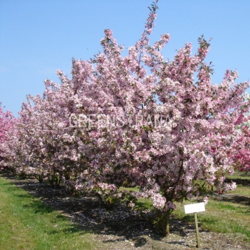 Дерево, во взрослом состоянии составляющее от 4 до 6 м в высоту, с вертикально растущей кроной диаметром до 6 м. Листья овальные, зеленого цвета, иногда оттеняют пурпурным. В момент распускания красные. По краям мелкие зубчики. В мае начинается обильное цветение дерева. Оно покрывается мелкими простыми цветочками с пятью лепестками. Они розовые или малиновые, более темные с обратной стороны. Плоды круглые желто-оранжевые, очень мелкие. Зреют в середине сентября, а потом долго остаются на ветках. Пригодны для употребления в пищу и приготовления сидра.