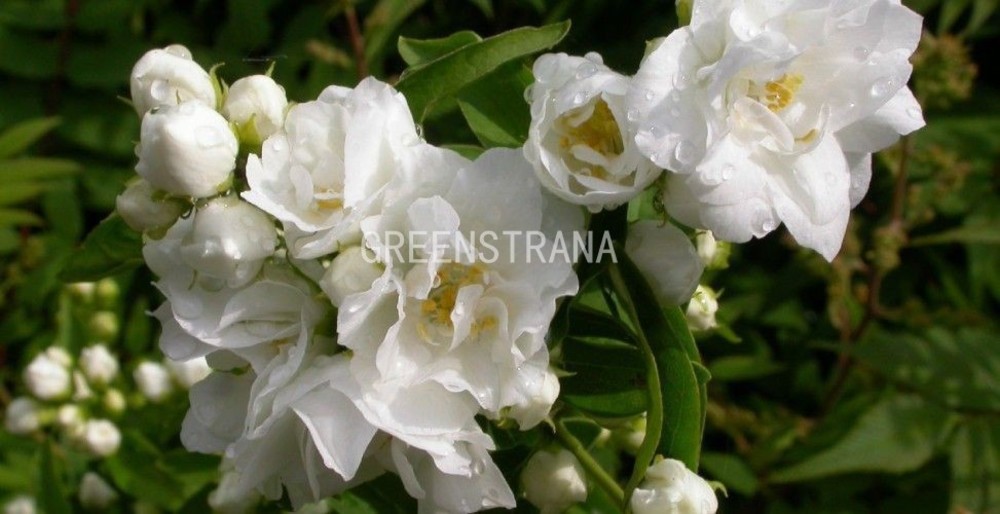 Кустарник с округлой кроной высотой и диаметром около 1,5 м. Листья супротивные, довольно крупные, шершавые, темно-зеленые с крупнозубчатым краем, снизу - светлее, с легким жестко-волосистым опушением. Осенней окраски не имеет. Бутоны круглые, крупные, зеленовато-белые, похожи на бусинки, рассыпавшиеся по кроне. Цветки крупные (до 4 см), махровые, кремово-белые, похожи на "розочку", собраны в небольшие, слегка пониклые, кисти. Цветет в конце июня - июле.