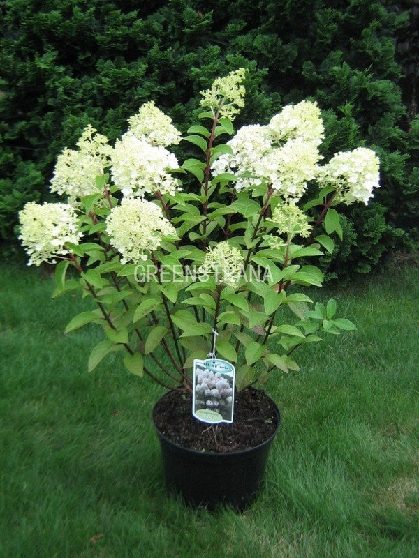 Его особенность – обильное цветение. Период цветения растения продолжается с июля по сентябрь. В это время гортензия покрывается плотными соцветиями конусовидной формы, которые меняют свой цвет от лимонного до розоватого оттенка.