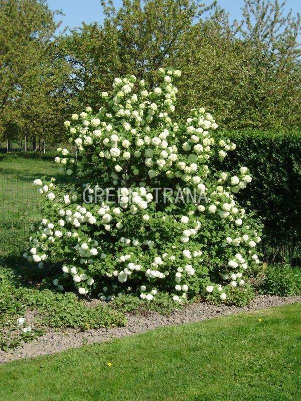 красивейший крупный сорт декоративной калины. Высота взрослого растения достигает 3 – 4 м. Оно имеет разрезные листья светлого зеленого окраса и гладкие плотные стебли, растущие во все стороны. Кустарник ценится за красивые белоснежные цветы, собранные в многочисленные крупные соцветия, напоминающие снежный шар. Купить калину Roseum стоит, если вы хотите создать на территории своего участка райский уголок. Растение цветет продолжительное время – с мая до конца июня. Плодов кустарник не дает.