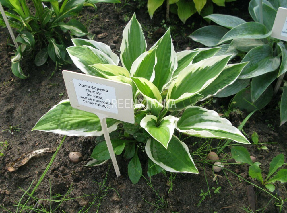 Хоста Форчуна 'Patriot' - среднерослый корневищный многолетник. Листья 18 х 13 см, овально-сердцевидные, слегка морщинистые, блестящие, тёмно-зелёные с неравномерной, широкой, кремово-белой каймой. Цветки бледно-лиловые, воронковидные, распускаются в июле. Сорт устойчив к солнцу.